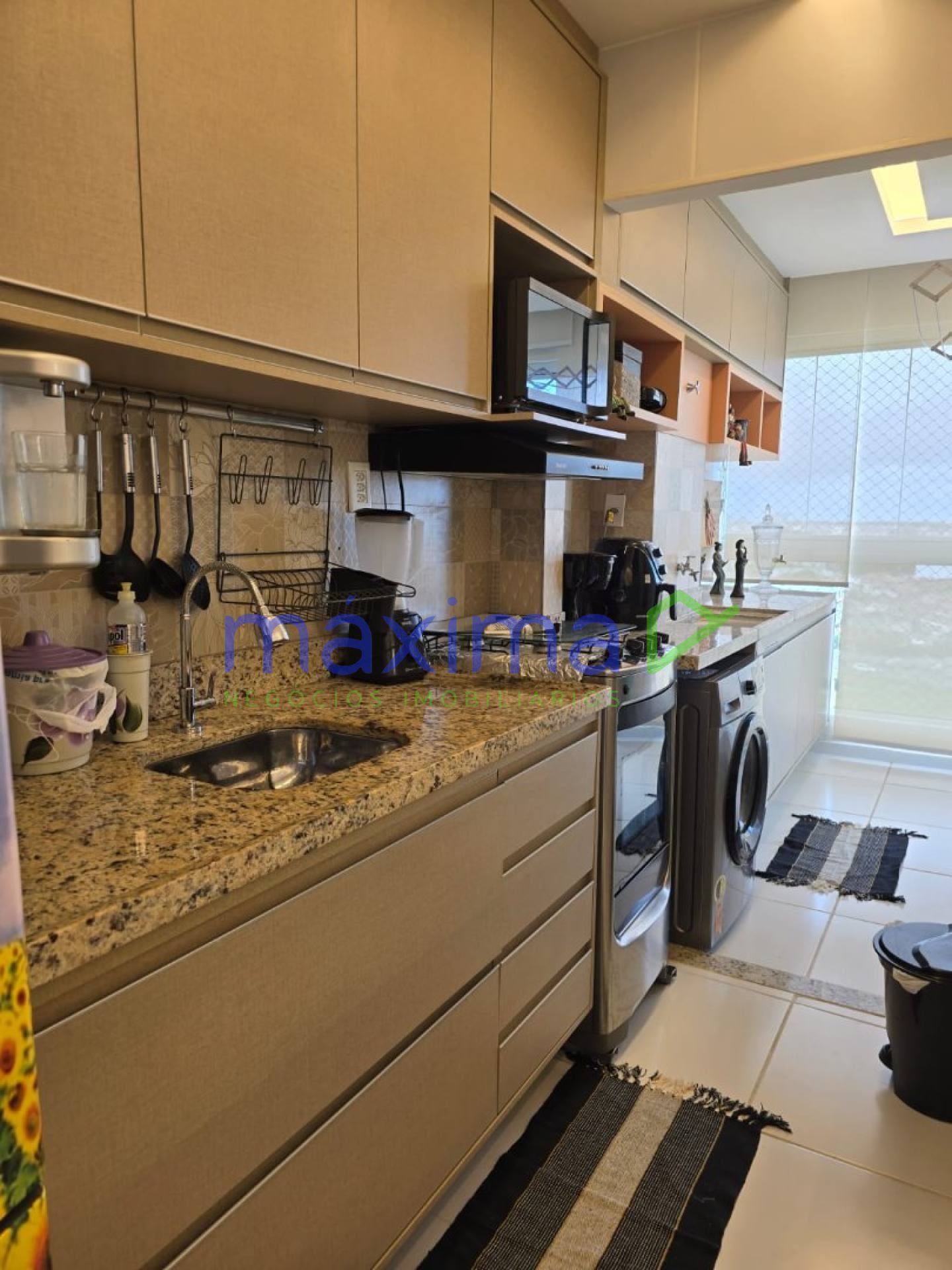 Cozinha completa, equipada com armários, eletrodomésticos e bancada em granito;