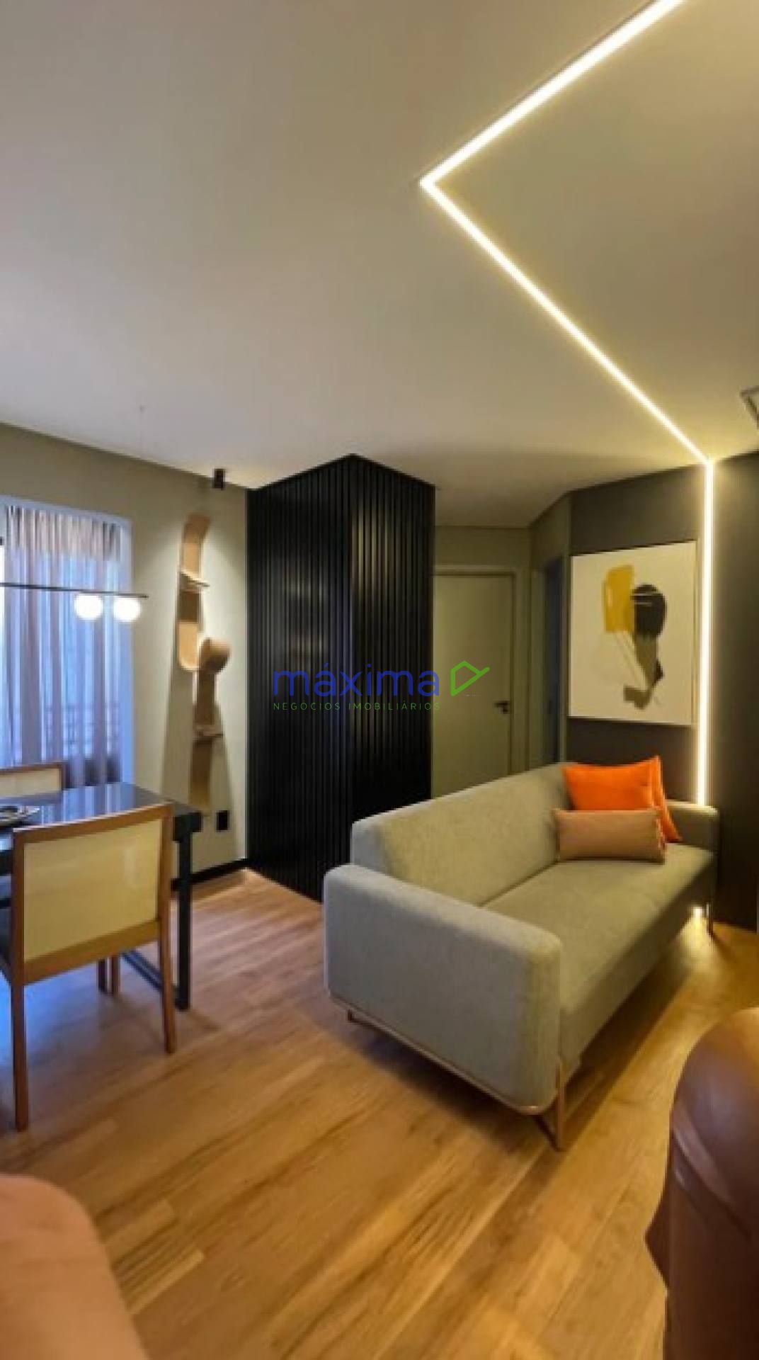 Ambiente elegante e acolhedor, com TV, painéis decorativos com textura lavável, sofá confortável, mesa de jantar, lustre, cortinas e decoração.
